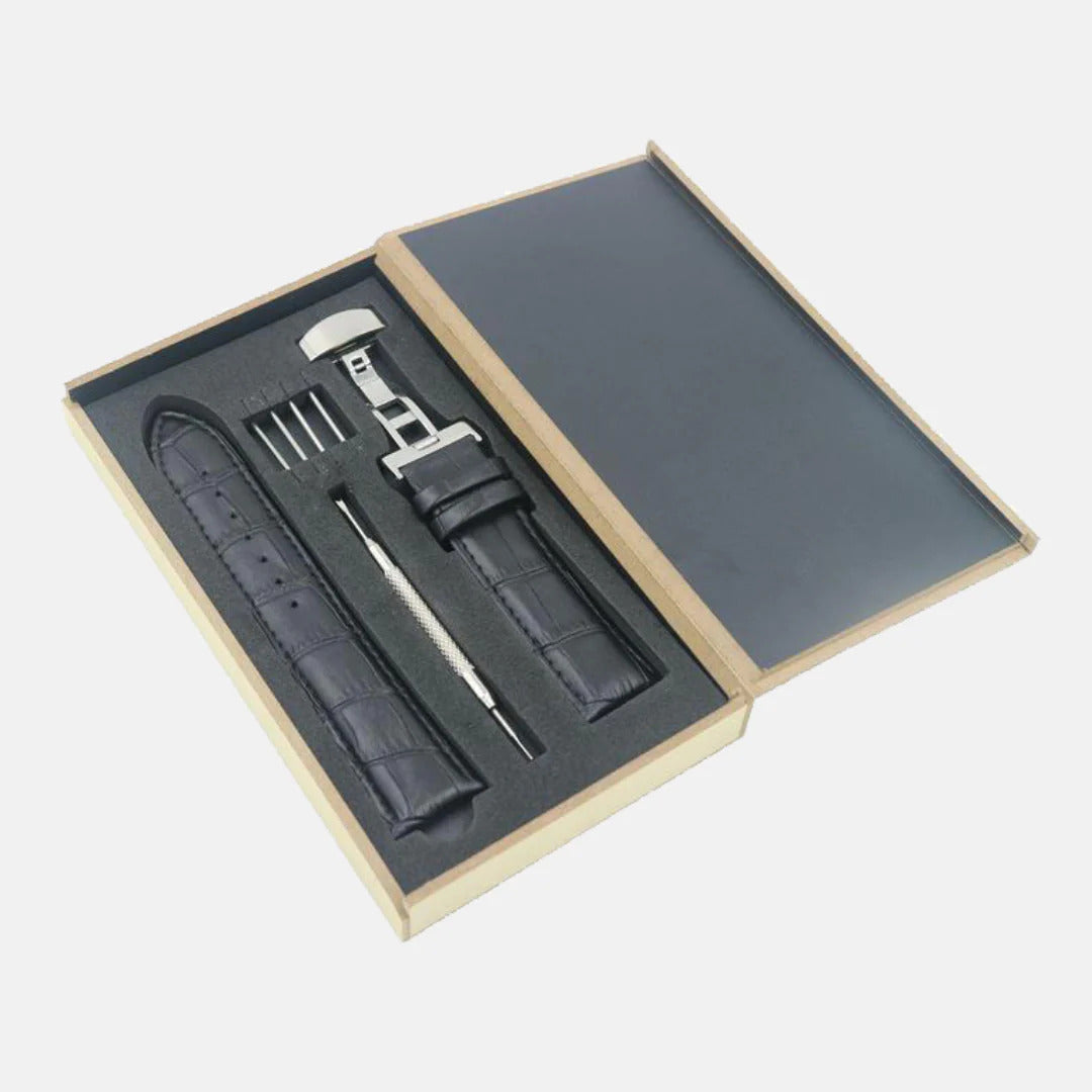 Inside you will find: two parts of the top grain leather strap, a spring bar remover, two quick release spring bars.